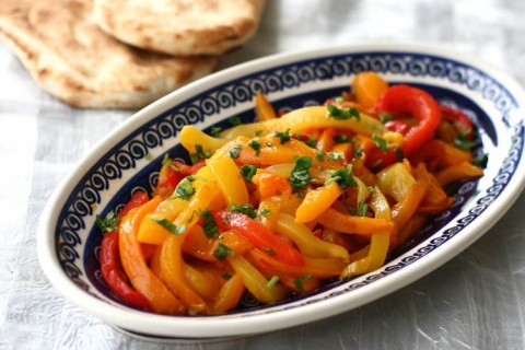 6. فى طبق التقديم نضع شرائح الفلفل ويوزع فوقها البصل ثم نوزع صلصة الخردل وتقدم بالهنا والشفا.