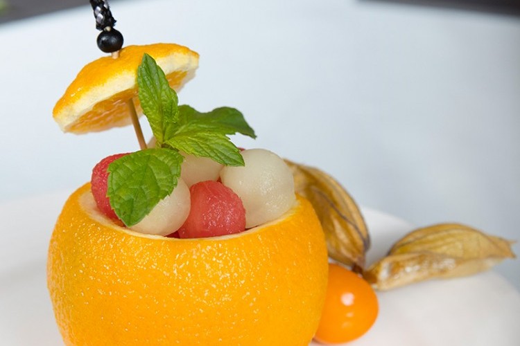1. 1. اقطعي رأسيّ حبة البرتقال من الاتجاهين بالسكين، واحتفظي بواحدة منها، وفرغي من محتواها بمقدار كافٍ لتصنعي منها صحناً تضعين الفواكة داخله.