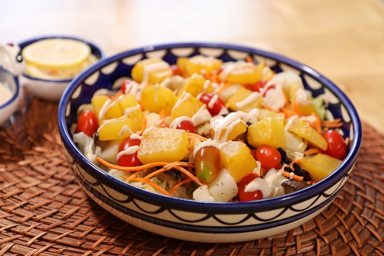 3. لتحضير السلطة: ضعي الخس في قاع طبق التقديم، ثم أضيفي الباذنجان المشوي، والبطاطس المسلوقة، والجزر المبشور، والطماطم الكرزية، والقرع.