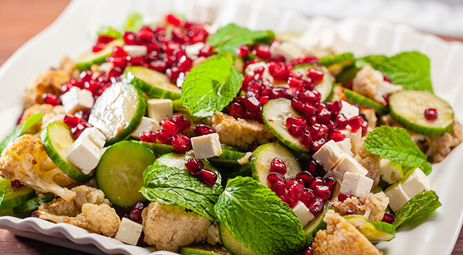 في وعاء اخر يخلط الخيار + الرمان + الملح + ملعقه طعام خل البلسمك ويخلط مع الزهره