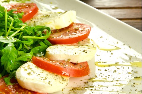 - والآن، وكما جرت العادة في تقديمها، نقوم بتوضيب أوراق الجرجير في وسط طبق تقديم مسطح ثم نقوم بصف دوائر جبن الموزاريلا والطماطم بالترتيب على محيط أوراق الجرجير، بحيث تكون متتالية من شريحة موزاريلا وشريحة طماطم.