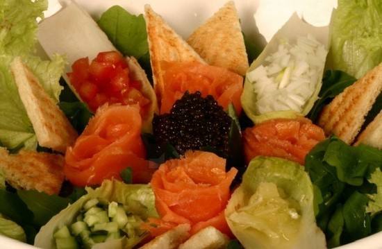 - ضعى المكعبات فى الطبق وضعي فوقها المايونيز والكافيار ورصي الخس والزيتون حولهم