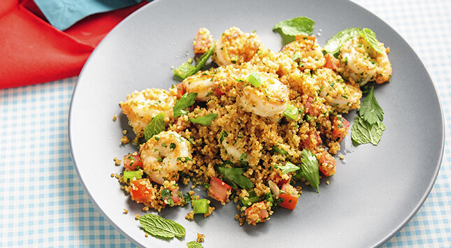يوضع الكسكس في طبق تقديم ويُزين بحبات الجمبري المشوية.