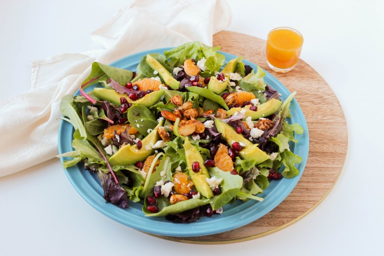 5. في وعاء التقديم نضع الخضار الورقية، نوزع فوقها الكلمنتينا، الرمان، الأفوكادو، جبنة فيتا واللوز المكرمل.