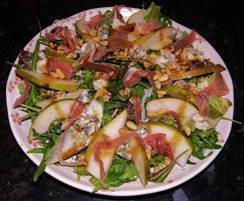 - في وعاء كبير، يوضع الجرجير والكمثرى والجبنة ويخلطوا جيداً، ثم تضاف إليهم التتبيلة ويخلطوا جيداً.