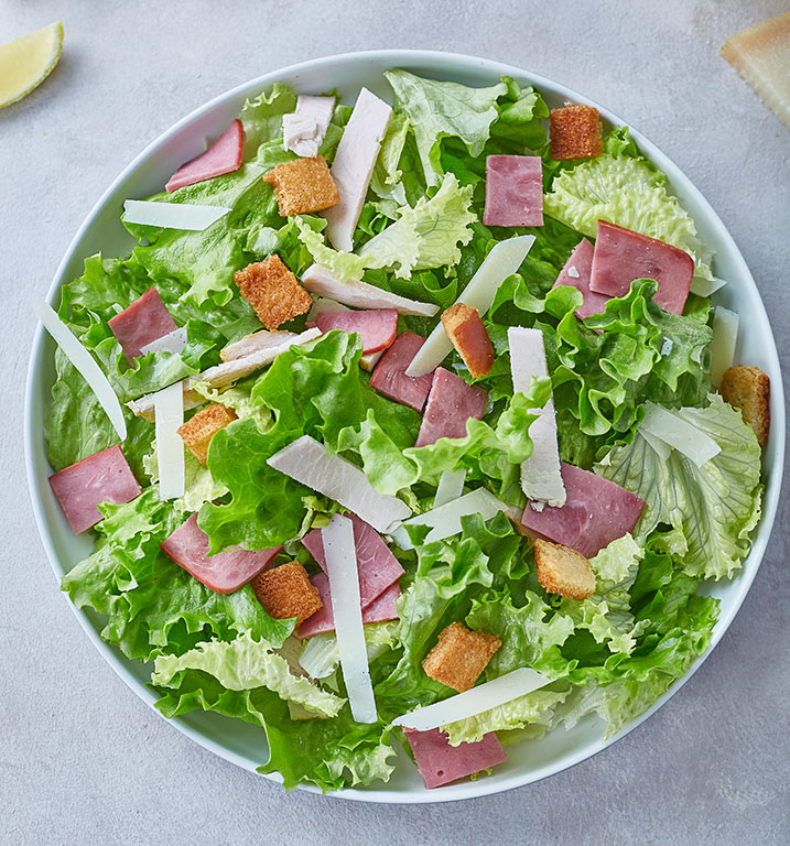 2. يُخلط الخسّ في وعاء كبير، مع صنفي اللحم المدخَّن (الحبش والمورتديلا)، وشرائح الجبن. تُقلَّب المكوِّنات المذكورة جيِّدًا.