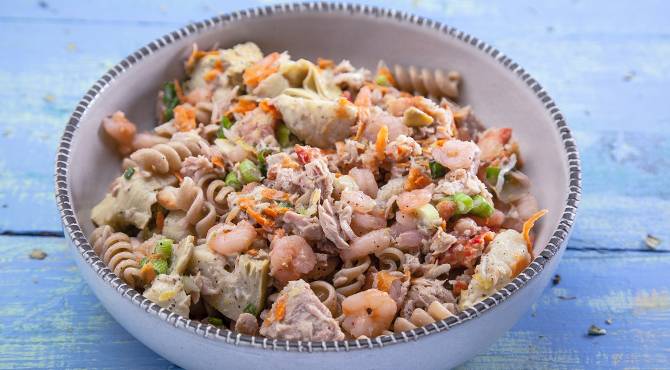 في وعاء مزج كبير، يخلط كل من المعكرونة المسلوقة ولحم السلطعون البحري والتونة والروبيان والجزر والبصل.