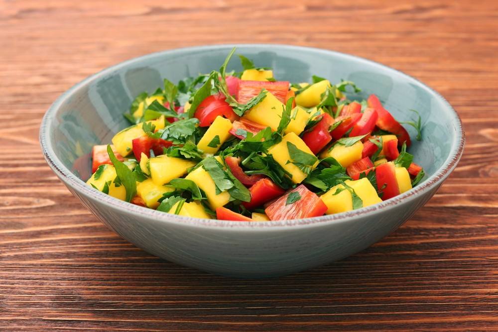 - توضع المانجو في بولة، ويضاف إليها الفلفل الاحمر والبقدونس، وتقلب جيداً.