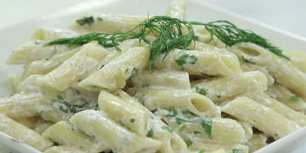 2. اخلطي مقادير الصلصة و أضيفي القليل من الماء ثم ضعيها فوق المعكرونة وزينيها بأوراق الشبت و قدميها باردة.