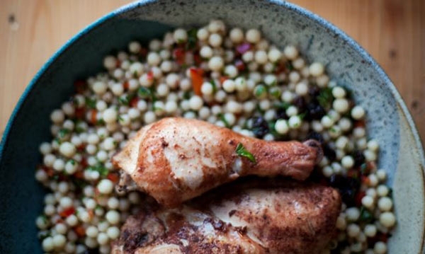7. للتقديم: وزّعي سلطة المغربية على أطباق التقديم، وضعي قطع الدجاج المشوي فوقها.