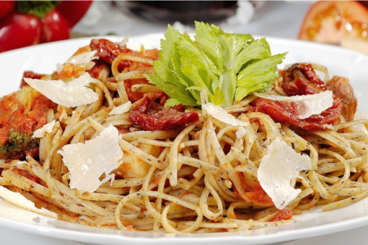 - أضيفي المكرونة ووزعي الجبن البارميزان والفلفل الأسود والطماطم المجففة وقلبي وقدميها دافئة أو باردة حسب الرغبة.