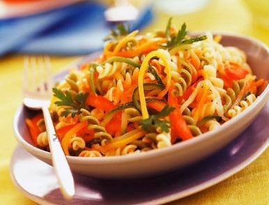 1. في طبق نضع الخل والمستردة والثوم المفروم ونضع باقي الخضروات المقطعة ثم نضيف المكرونة والملح والفلفل ونخلطهم ونضعها في طبق التقديم .