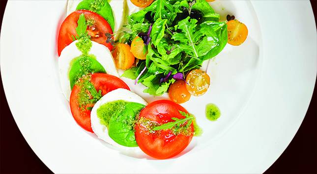 تُرص الطماطم وجبن الموتزاريلا والأفوكادو بشكل تزييني في حلقات في أطباق تقديم، وتُقطع أي شرائح جبن كبيرة إلى نصفين، وتُبعثر أوراق الريحان الممزقة على الوجه.