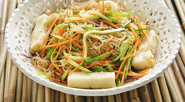 توضع النودلز في وعاء كبير الحجم وتُغطى بالماء البارد. تُنقع لمدة 20 دقيقة، ثم تُصفى من منخل ناعم وتٌنقل إلى وعاء كبير الحجم. يضاف التوفو والجزر والبازلاء السكرية.