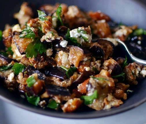 - تخلط مكعبات الباذنجان المقلية مع قسم من الصلصة.