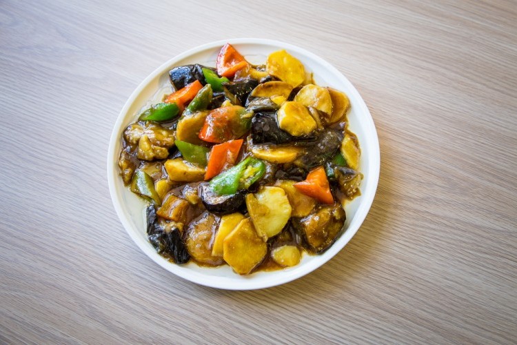 - نقلي البطاطس والباذجان والخبز حتى يحمرّ.