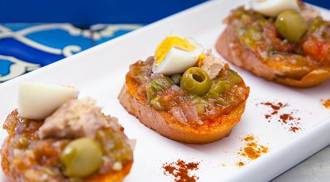 تفرد السلطة المشوية على شرائح خبز الباجيت المنقوع، ويوضع على وجهها شريحة من البيض المسلوق والتونة والزيتون المنزوع البذور.