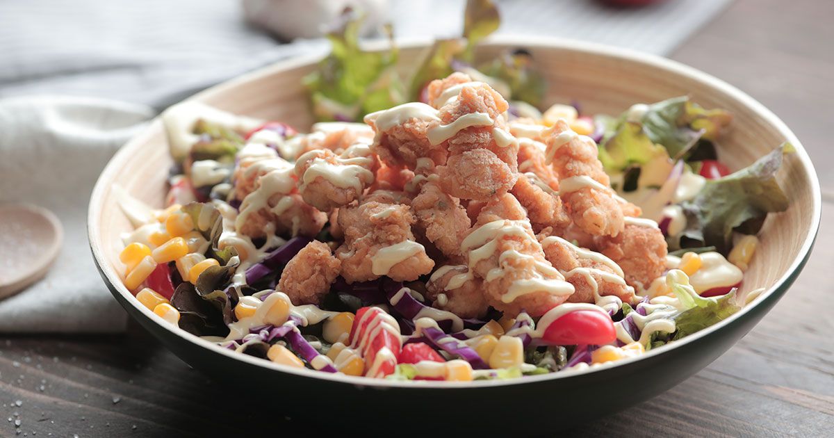 6- لتحضير السلطة، ضعي الخسوالملفوف في طبق التقديم. وزّعي الطماطم الكرزية والذرة ثمّ أضيفي قطع الدجاج.