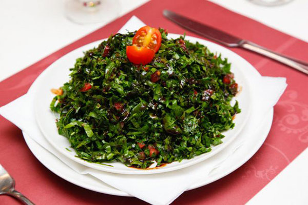 3. تخلط هذه المكوّنات، وتوضع في طبق التقديم، وتنثر نصف ملعقة صغيرة من السمّاق عليها، وتسكب ملعقة كبيرة من دبس الرمّان، مع الخلط مجدّداً.