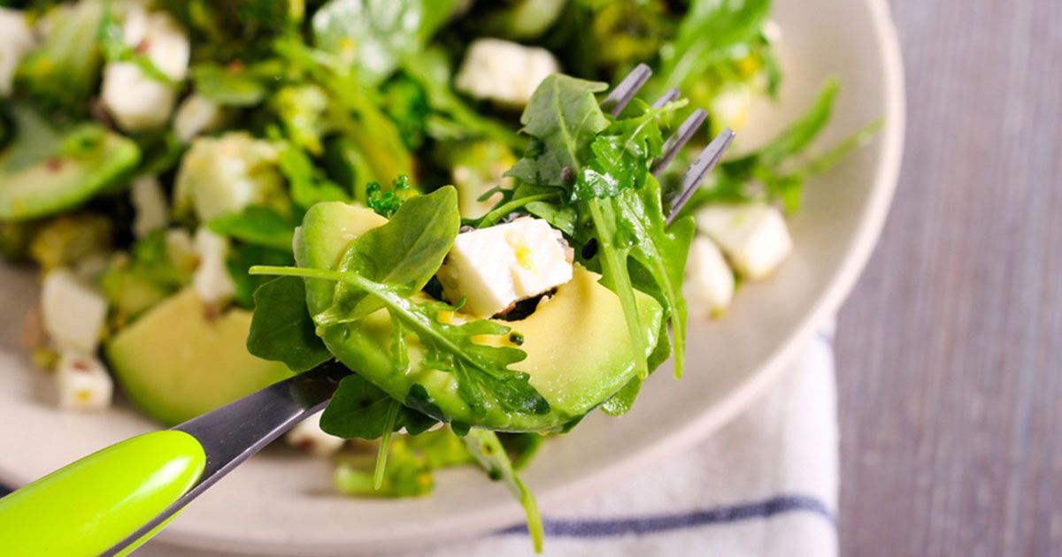 2- في طبق التقديم، ضعي الجرجير، الأفوكادو وجبن الفيتا.
