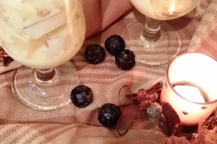 1. يصفى الأناناس من الماء تماما ويوضع طبقة منه في قاع الكأس ثم يقطع جوز الهند إلى شرائح رفيعة بإستخدام قشارة البطاطس ويوضع فوق طبقة الأناناس ثم طبقة أخرى أناناس وطبقة أخرى من شرائح جوز الهند.