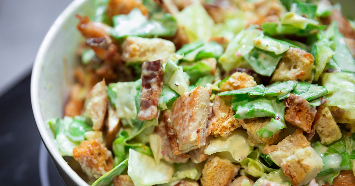 2- في وعاء، ضعي الخسّ، الكروتون، جبن الشيدر، الطماطم والدجاج المقلي.