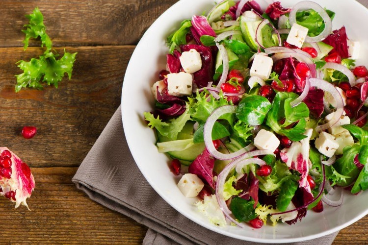 1. اخلطي الخس مع الملفوف الأحمر والبصل والبروكلي والفلفل في طبق.