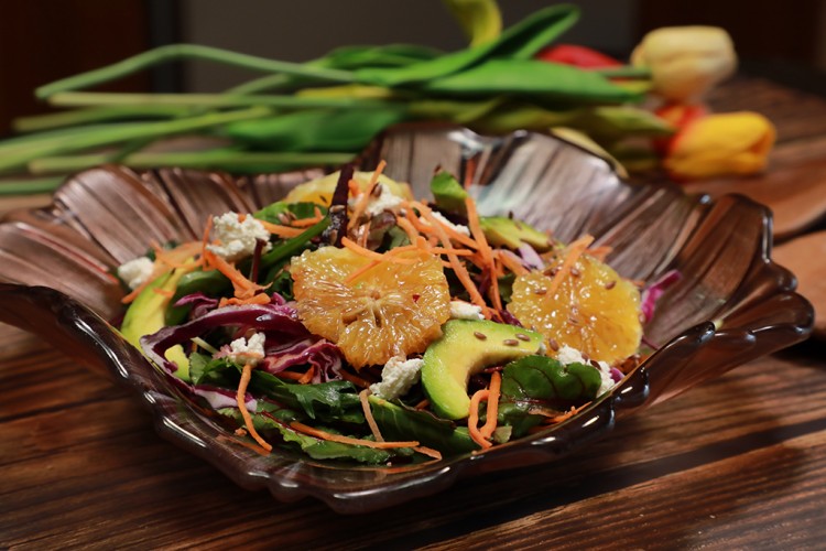 - في طبق التقديم، ضعي الأعشاب المشكلة، ثم أضيفي الجزر، والملفوف الأحمر، والشمندر، والأفوكادو، وشرائح البرتقال.