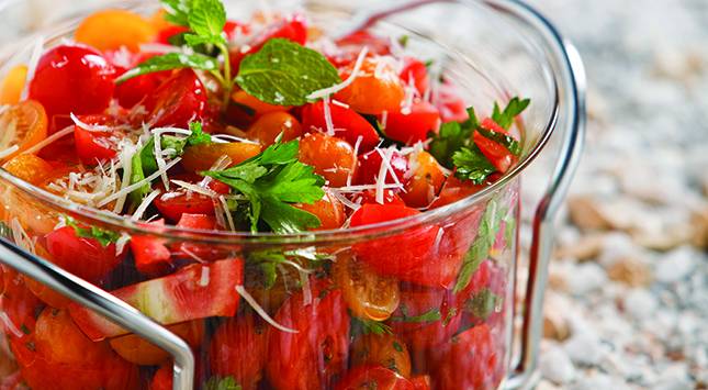تُفرغ الطماطم كبيرة الحجم من البذور وتُقطع إلى جوانح، وتزال السوق من الطماطم الكرزية وتُقطع إلى أنصاف.