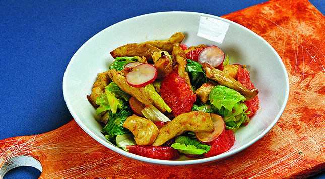 يُضاف الدجاج المطهي والخس ويُقلبا حتى يختلطا. تُقدم السلطة وعلى وجهها الفجل وفصوص الجريب فروت المحفوظة.