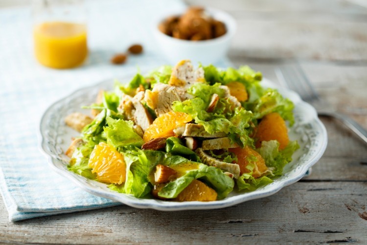 - اخلطي الخس مع الدجاج المشوي والبرتقال والجوز في طبق.