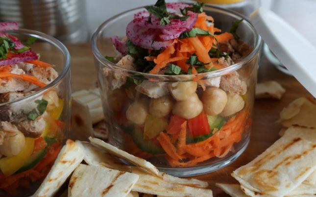 1. ضعي مكوّنات السلطة، في طبق زجاجي كبير، أو في أطباق شفّافة فردية.