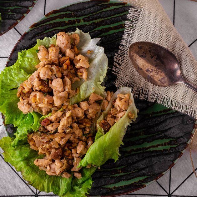 في مقلاة يضاف زيت السمسم وزيت الزيتون ويضاف الدجاج المفروم ويقلب