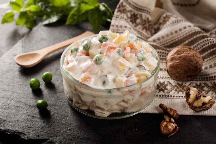 سلطة روسية بالمايونيز … من السلطات الشهية والمحضرة بالبطاطس مع تشكيلة من الخضار الطيبة بتتبيلة المايونيز الغني والشهي، قدميها كطبق جانبي مميز وشهي