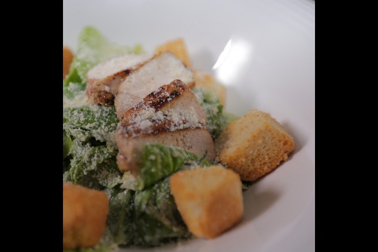 4. انقلي الخس لطبق التقديم، ورشي القليل من جبنة البارميزان المبروشة ا، والخبز المحمص، وضعي شرائح من صدر الدجاج المشوي، وقدميها باردة.