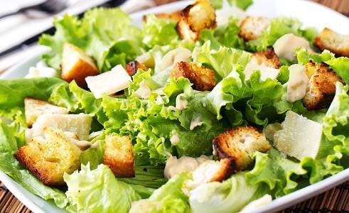 1. ضعي الخس والدجاج والخبز في طبق التقديم .