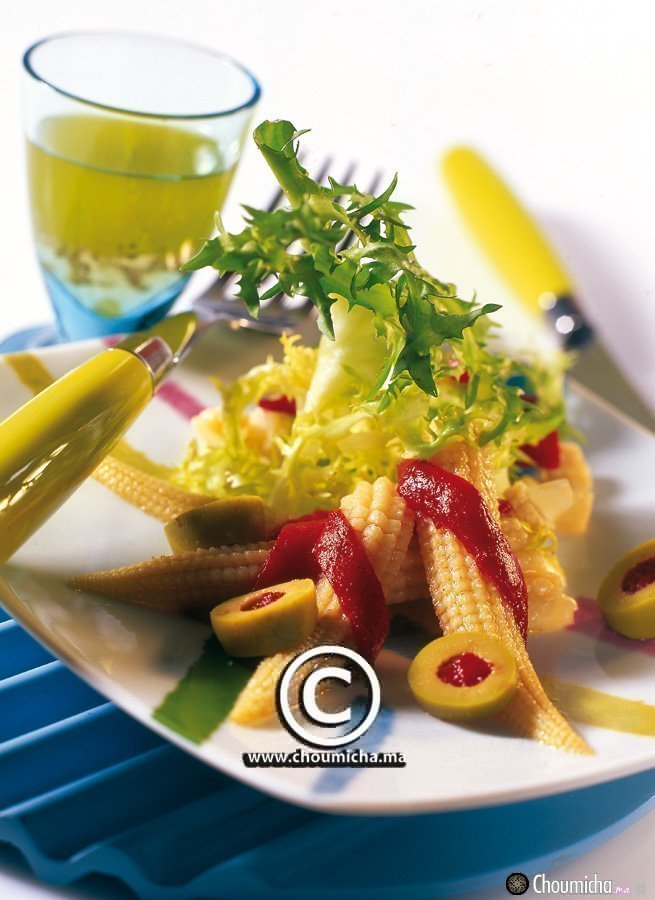 - في طبق التقديم، توضع قلوب الخس، تصفف فوقها أنصاف عرنوس الذرة وشرائط الفلفل.
