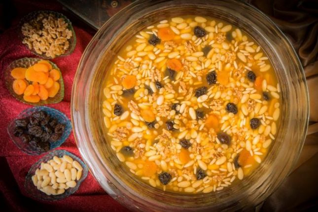 1- انقعي القمر دين في 500 مل من الماء وانقعي الزبيب والمشمش المجفف والخوخ والجوز والصنوبر في 500 مل أخرى من الماء في الثلاجة لليلة ويوم.