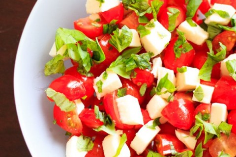 1. نرص الطماطم الشيرى والجبن الموزريلا فى طبق التقديم.