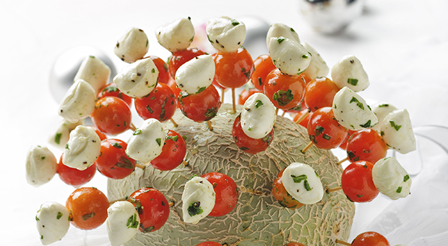 توضع حبة طماطم وقطعة من جبن الموتزاريلا في كل عود أسنان.