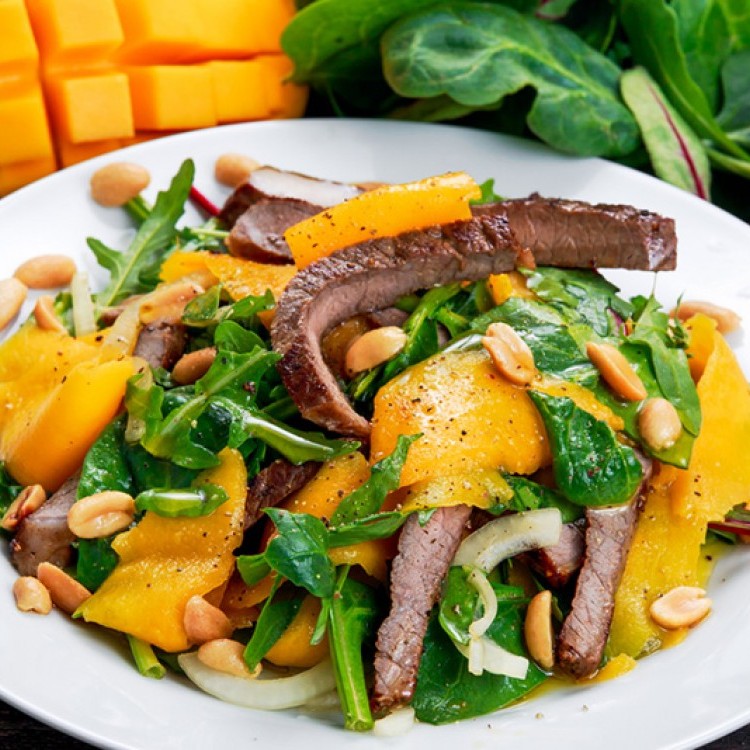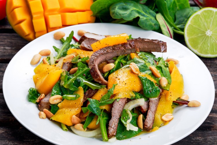 سلطة لحم الستيك مع المانغا لرجيم متوازن .. جربي تحضير هذا الطبق الغني من السلطة أثناء اتباعك للرجيم وشاركينا رأيك بطعمه الطيب