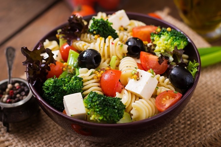 - وزعي المعكرونة في طبق، أضيفي الطماطم، والبروكلي والفطر، الذرة والزيتون وجبن الفيتا.