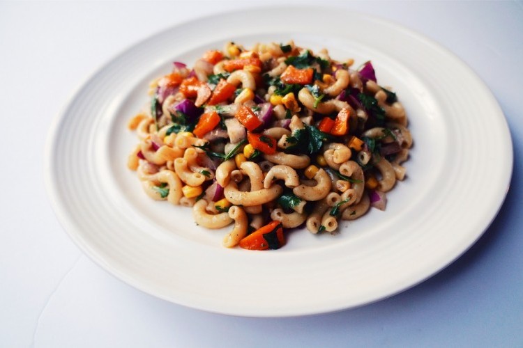 - ضعي المكرونة مع الفاصوليا الحمراء والذرة والفلفل الأخضر والأحمر في طبق عميق واسع.