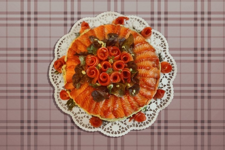 4.  في قالب التقديم، توضع طبقة من هذه الحشوة ويوضع على الأطراف شرائح سلمون مدخّن ومن ثم طبقة من الشمندر.