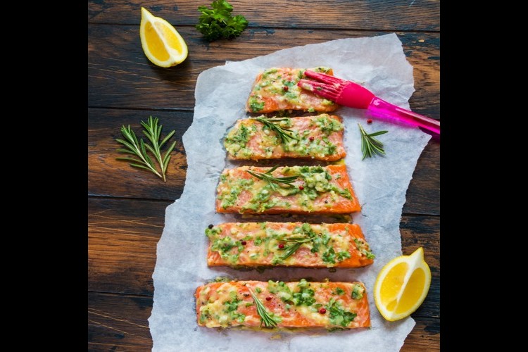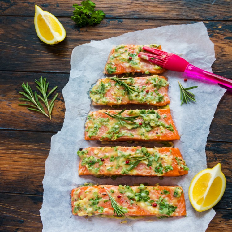 4. وزعي الملح والفلفل الأسود والثوم والشبث المفروم على السلمون.