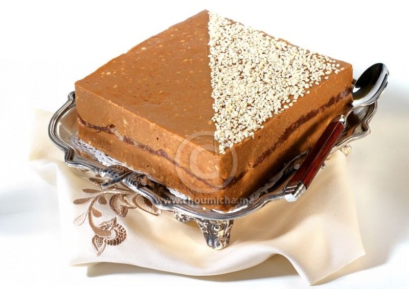 • يسوى السطح ويترك سلو يرتاح لمدة ساعتين في الثلاجة. يزال سلو من القالب ويزين ببذور السمسم الأبيض.
