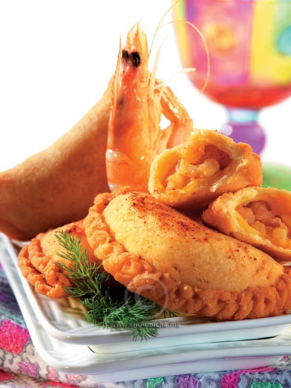 - تحشى كل دائرة عجين بالقليل من الحشوة. يطوى العجين لتشكيل هلال ثم يضغط على جوانبه لإلصاقها.