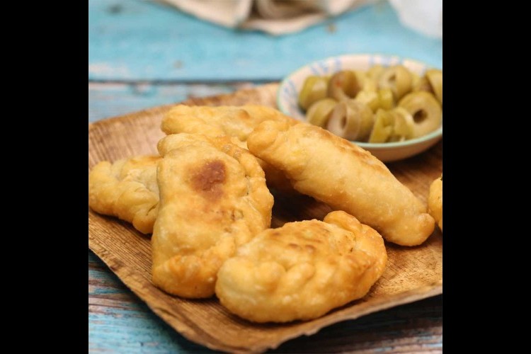 5. تٌفرد العجينة وتُقسم على هيئة كرات صغيرة ثم تُفرد كل كرة وتُحشى بمقدار ملعقة صغيرة من الحشوة ثم اقفل جيدا وهكذا حتى انتهاء الكمية.