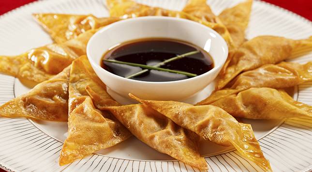 يدهن كل جانبين متجاورين من اللفائف بالماء، ثم تلف اللفائف على شكل مثلثات ويضغط على الحواف معًا لإحكام إغلاقها.