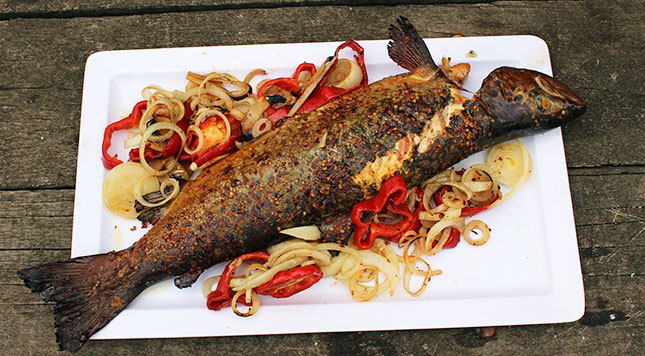 تدخن السمكة على درجة حرارة منخفضة كي تصبح نكهتها غنية ثم تطهى على نار عالية كي تنضج. لا تبالغوا في طهي السمكة!